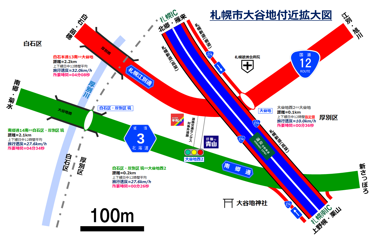 ¤´Í÷¤ÎÄ̤ꡢÂçëÃÏÀ¾2¤Î¸òº¹ÅÀ¤Çƻƻ3¹æ¤È¹ñÆ»12¹æ¤¬»¥ËÚ»ÔÆ»¤ò²ð¤·Ìó50m¤È¤¤¤¦¶Ë¤á¤ÆÃ»µ÷Î¥¤Þ¤ÇÀ᤹ܶ¤ë¡£