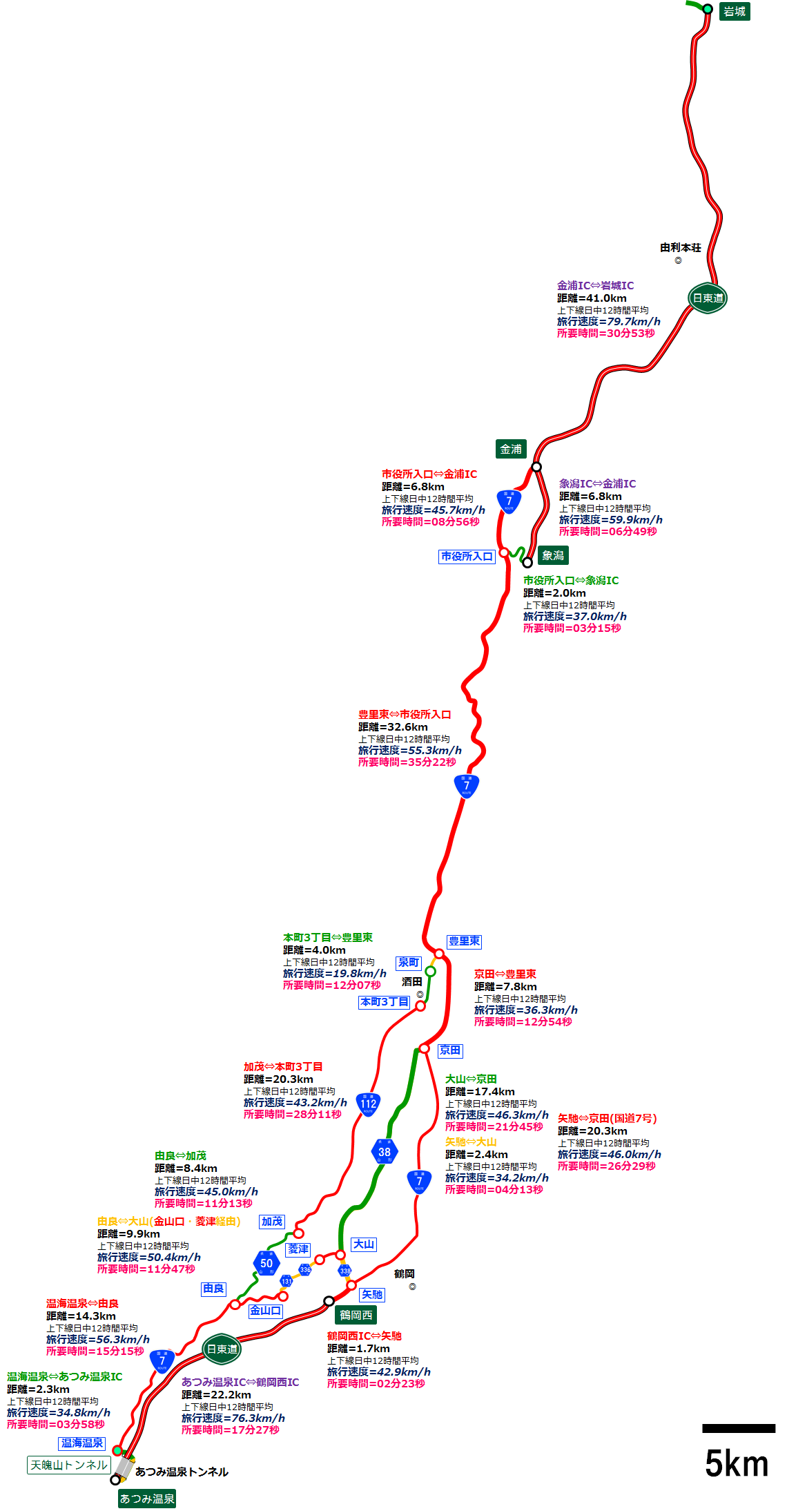 ¤´Í÷¤ÎÄ̤ê¤Ç¡¢²¹³¤²¹Àô¸òº¹ÅÀ¢Î´ä¾ëIC¤Î°ìÈÌÆ»(²¼Æ»¡¢ÌµÎÁ¹â®)ºÇ®¥ë¡¼¥È¤Ï¡¢ÆüÅìÆ»¡¡¤¢¤Ä¤ß²¹ÀôIC¡ÝÄᲬÀ¾IC¤È»³·Á¸©Æ»38¹æ¤È¹ñÆ»7¹æ¤ÈÆüÅìÆ»¡¡¶â±ºIC¡Ý´ä¾ëIC¤òÁö¤ê·Ñ¤°¥ë¡¼¥È¤Ç¡¢µ÷Î¥=132.4km¡¢Ê¿¶Ñι¹Ô®ÅÙ=54.5km/h¡¢½êÍ×»þ´Ö=2»þ´Ö08ʬ15ÉᢤȤ¤¤¦¤È¤³¤í¤Î¤è¤¦¤À¡£