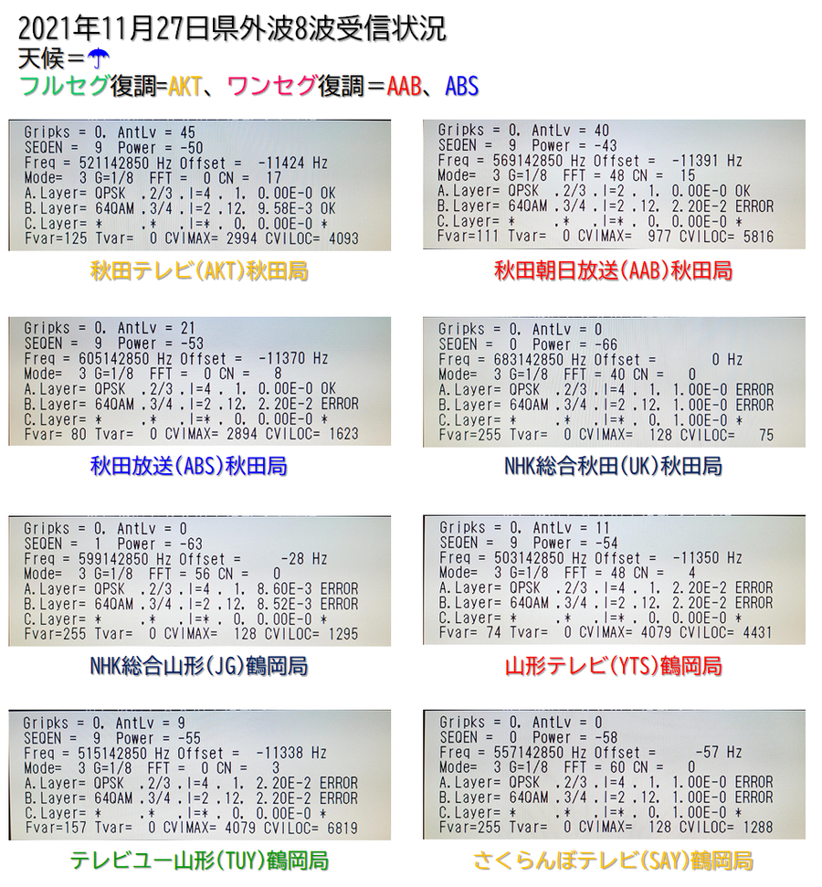 | ¼Â»ëİ | ¥ì¥Ù¥ë | ¼õ¿®ÅÅÎÏ (dBm) | BER | C/N (dB) | AAB | ABS | NHK | ||