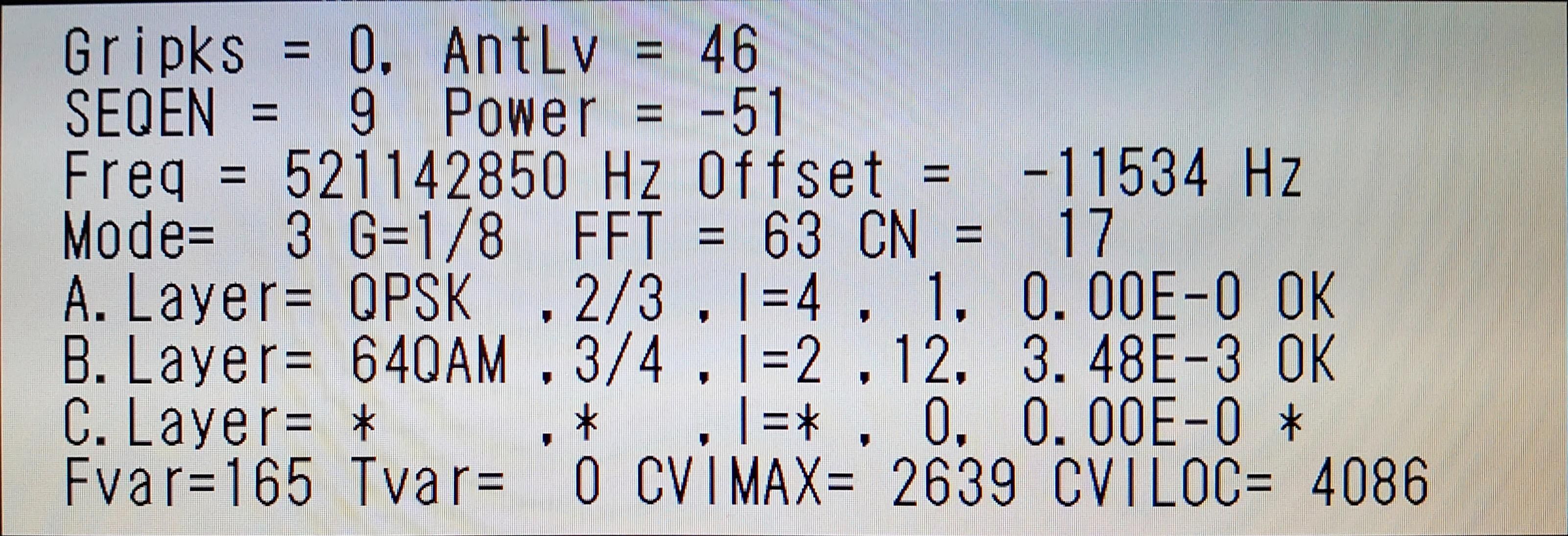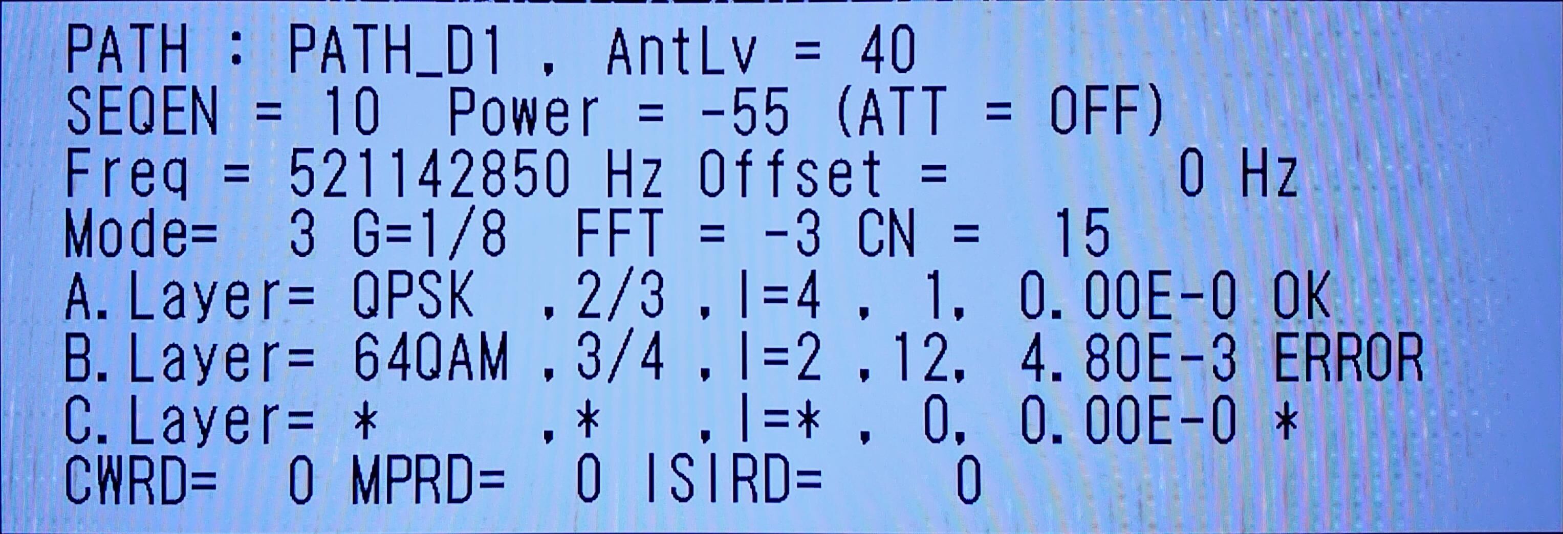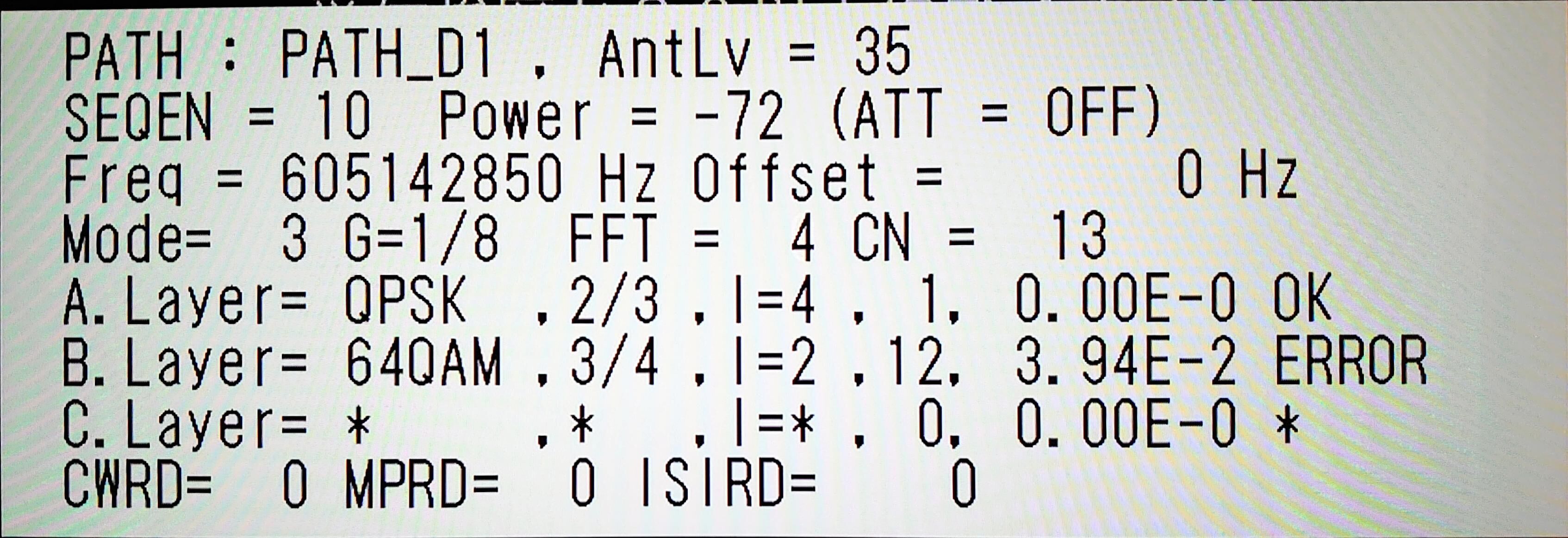 ¡¡½©ÅÄÊüÁ÷·¯¤Ï¤¤¤Ä¤âC/N=13dB¤À¤Ê¡£POWER=-72dBm¡¢E-2(100¥Ó¥Ã¥È¤¢¤¿¤ê3.94¤Î¥¨¥é¡¼)¤Ç¡¢º£Æü¤â±Ç¤é¤Ê¤¤¡£