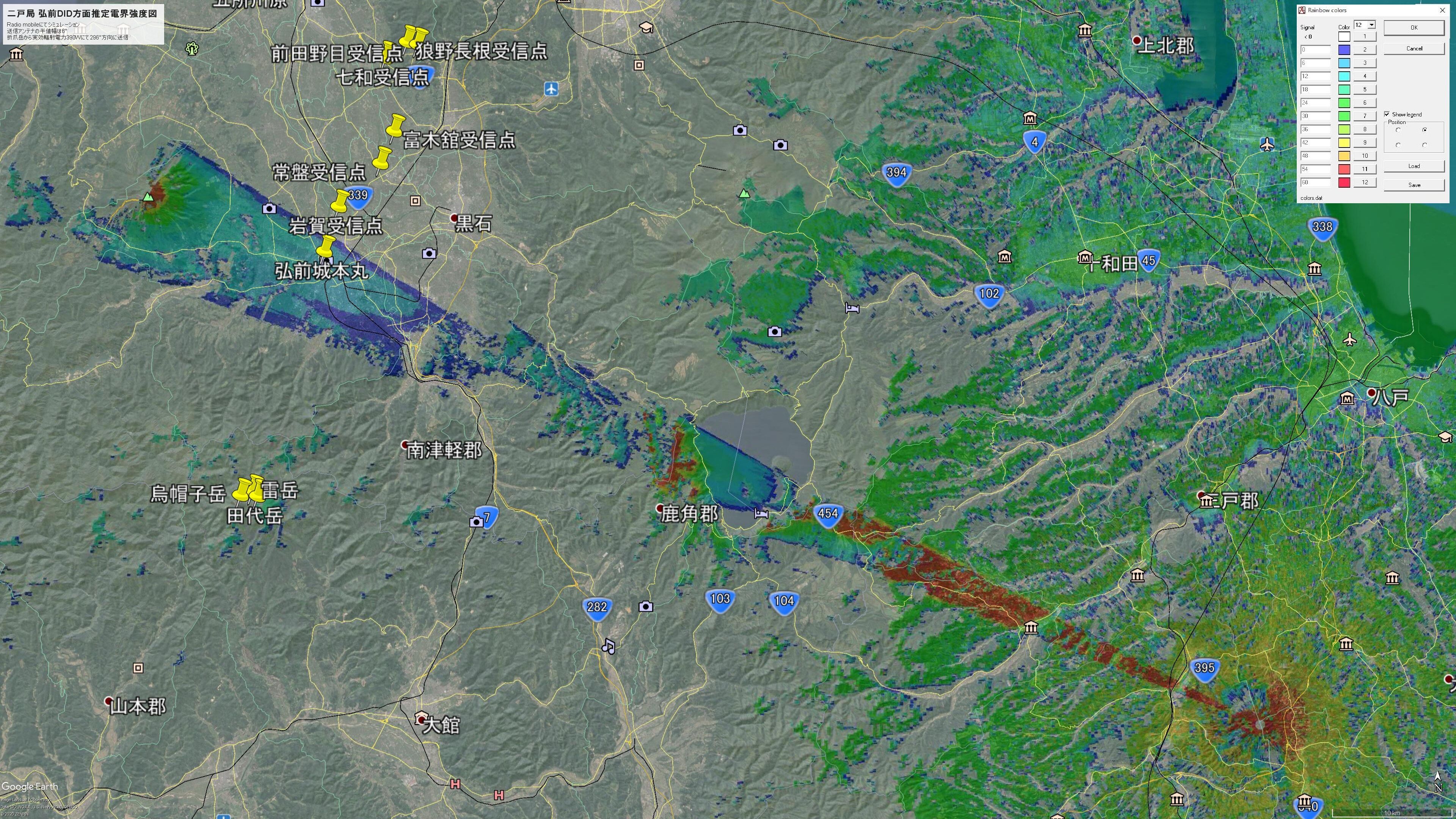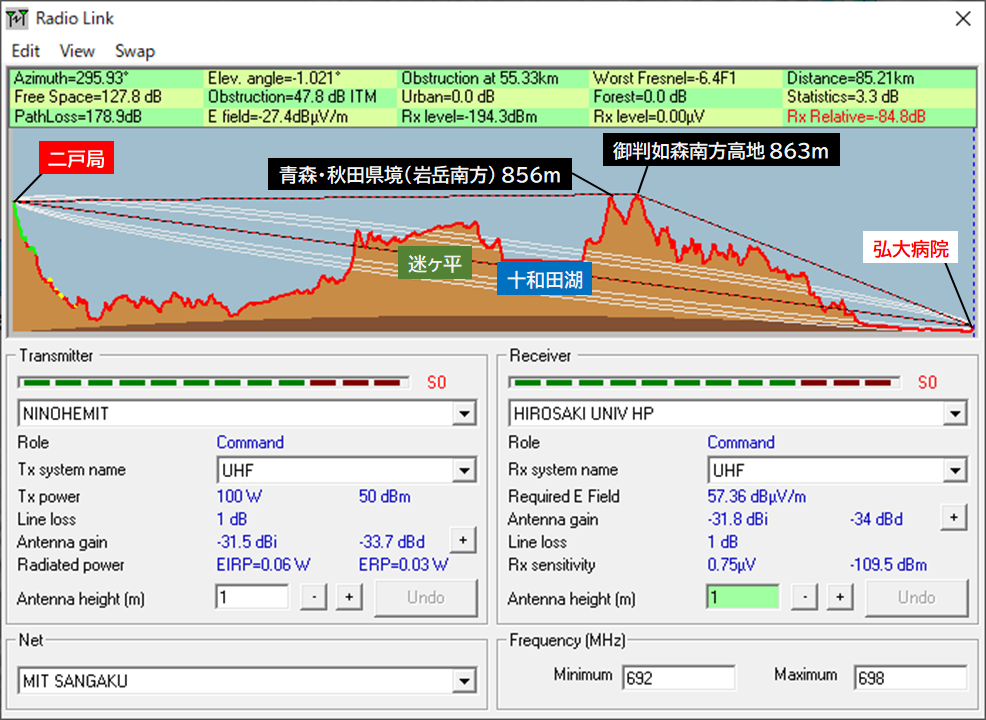 ¡¡¤µ¤Ã¤½¤¯¡¢Radiomobile¤ÇÆó¸Í¶É¤«¤é¹°Á°»Ô³¹ÃÏÊýÌ̤ò¥·¥ß¥å¥ì¡¼¥·¥ç¥ó¤·¤Æ¤ß¤ë¡£´Ö¤ò¤È¤Ã¤ÆÁ÷¿®Êý¸þ¤Ï296¡ë¤Ç¡¢È¾ÃÍÉý6¡ë¤ÇERP=390W¤Ç¹°Á°ÊýÌ̤˽Ф¹¥·¥ß¥å¥ì¡¼¥·¥ç¥ó·ë²Ì¤¬²¼¿Þ¡£