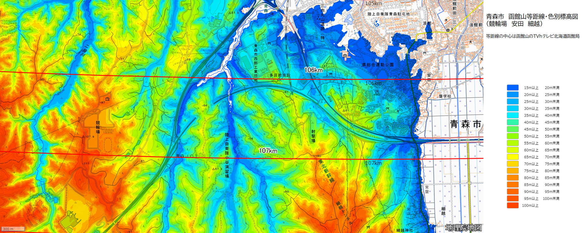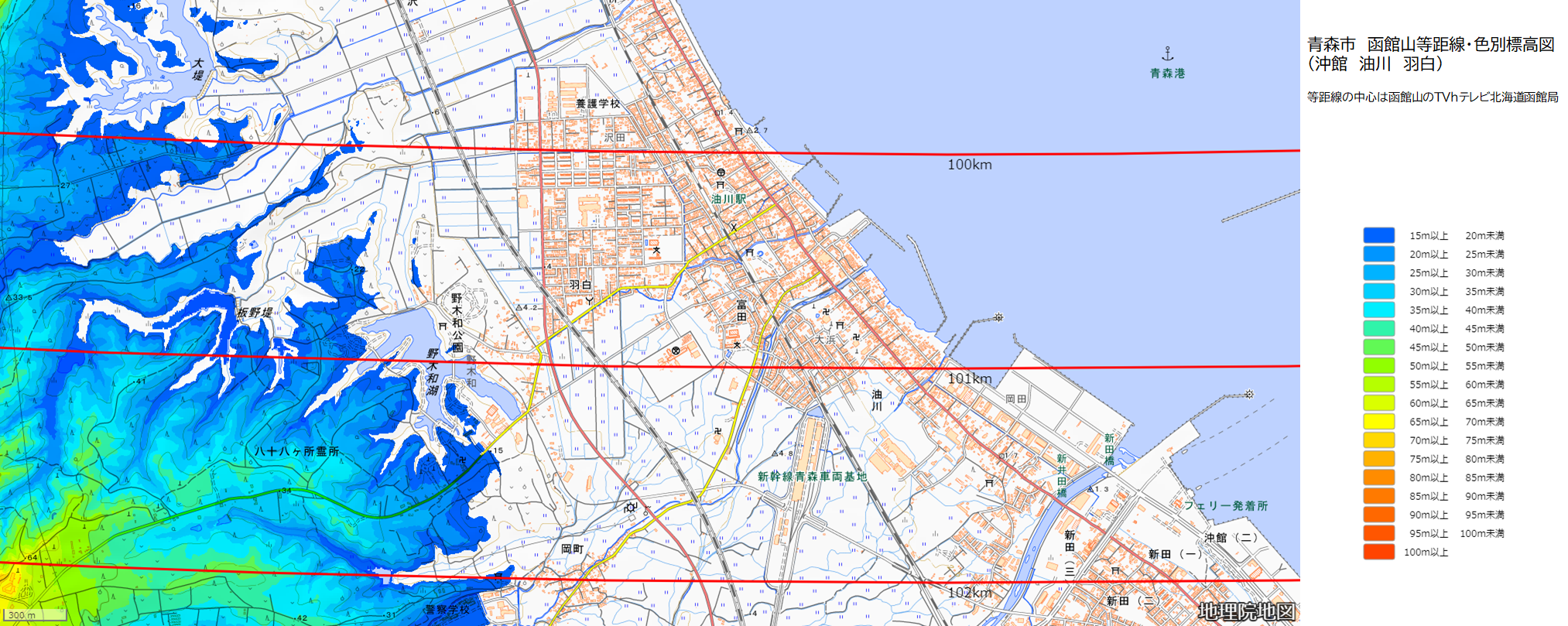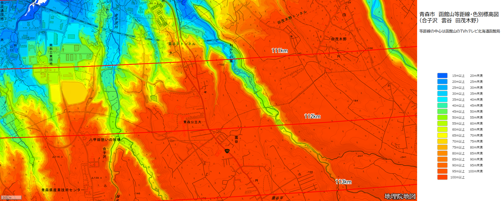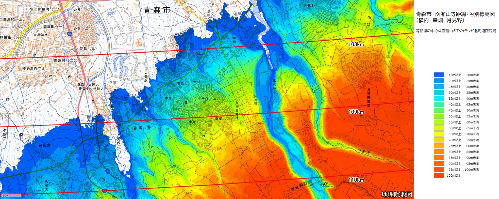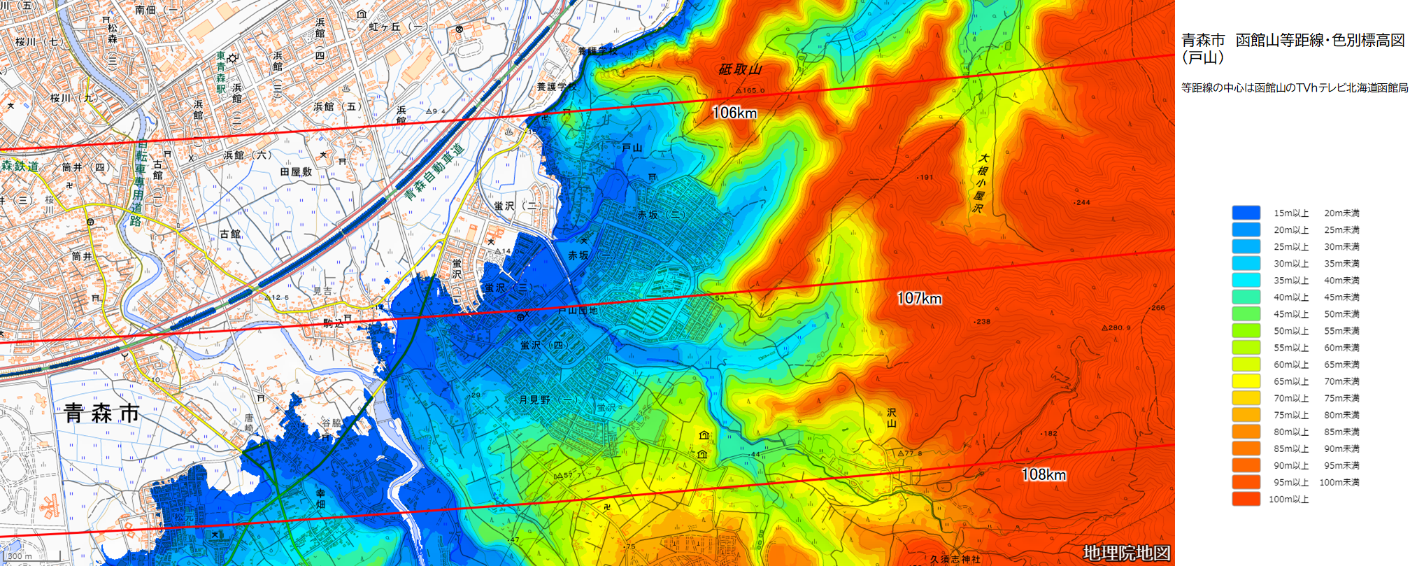 ¡¡¾å¿Þ¤Ï¹ñÅÚÃÏÍý±¡¤ÎÃÏÍý±¡ÃϿޤòÍøÍѤ·¡¢¥Æ¥ì¥ÓË̳¤Æ»(TVh)È¡´ÛÁ÷¿®½ê¤òÃæ¿´ÅÀ¤È¤·¤ÆÈ¾·Â1km¤´¤È¤ÎƱ¿´±ß¤ò¡¢ÀÄ¿¹»Ô³¹¤ËÉÁ¤¤¤¿ÃϿޤǤ¢¤ë¡£¿§ÊÌɸ¹â¿Þµ¡Ç½¤òÍøÍѤ·¤Æ¡¢ÀÄ¿¹»Ô¤Îɸ¹â¤âɽ¸½¤·¤¿¡£