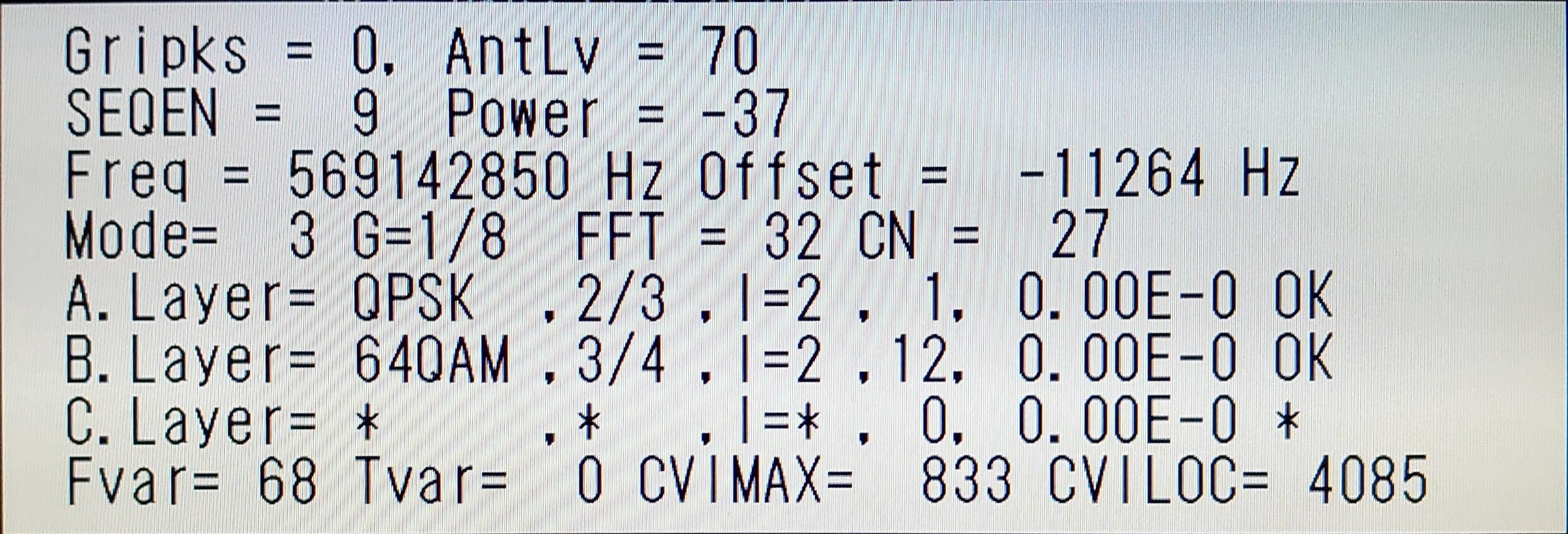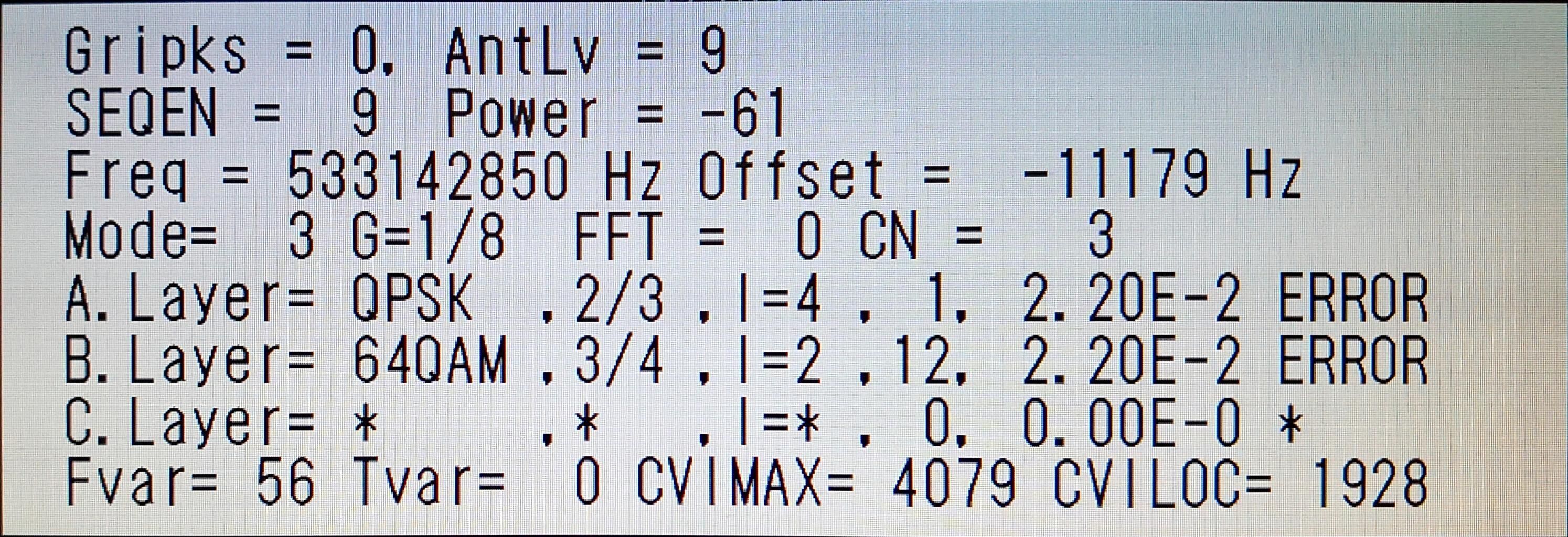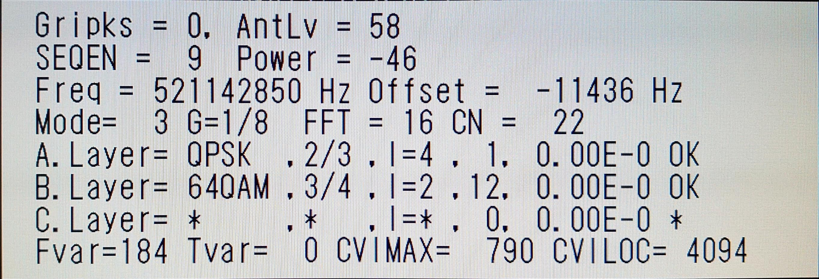 ![]() | ½©ÅÄÄ«ÆüÊüÁ÷(AAB) AntLV=70 POWER=-37dBm C/N=27dB BER 0.00E-0 |
