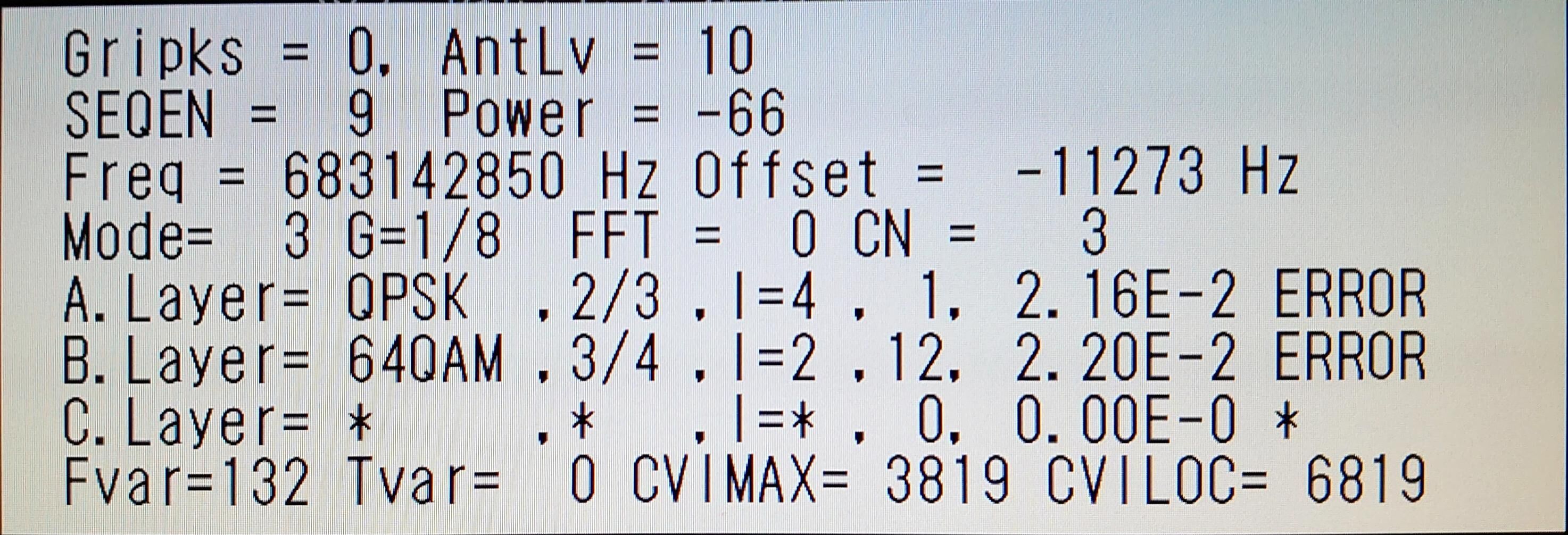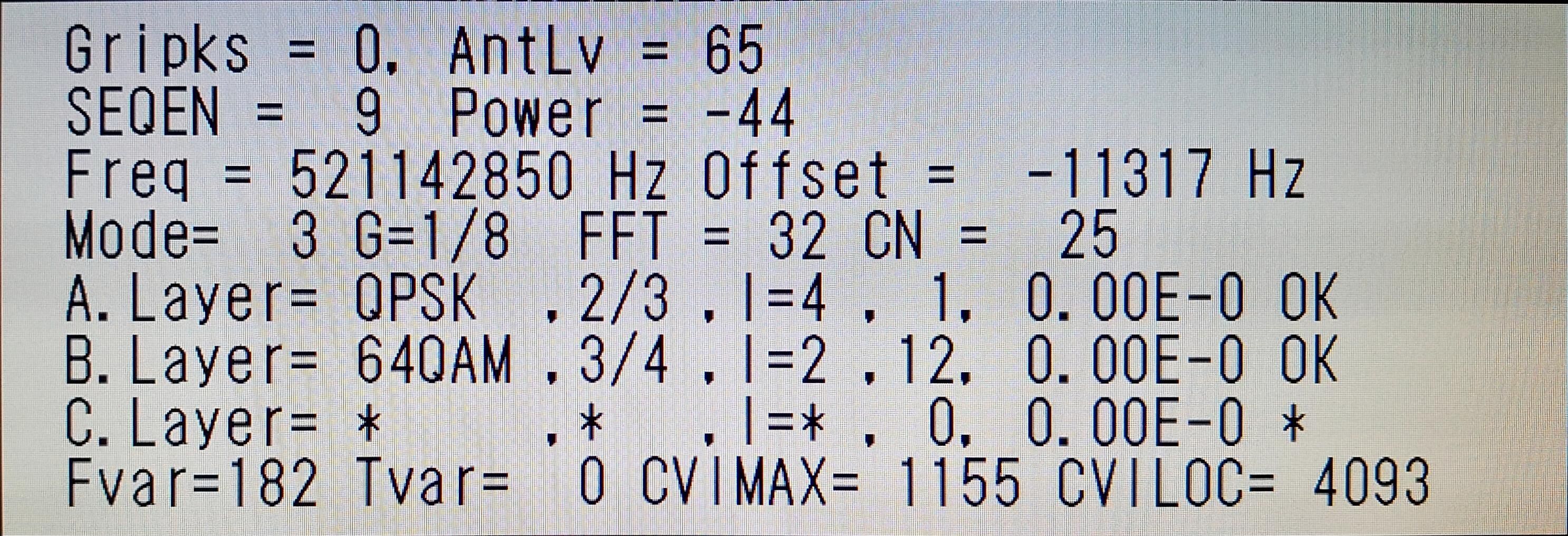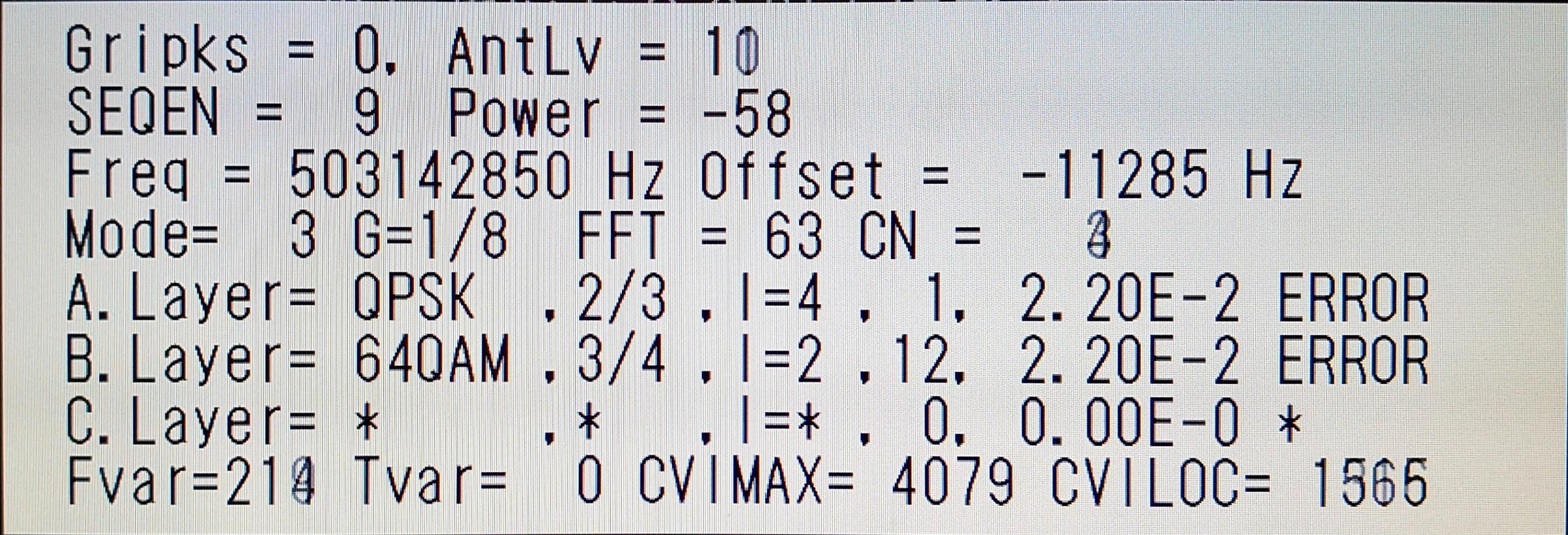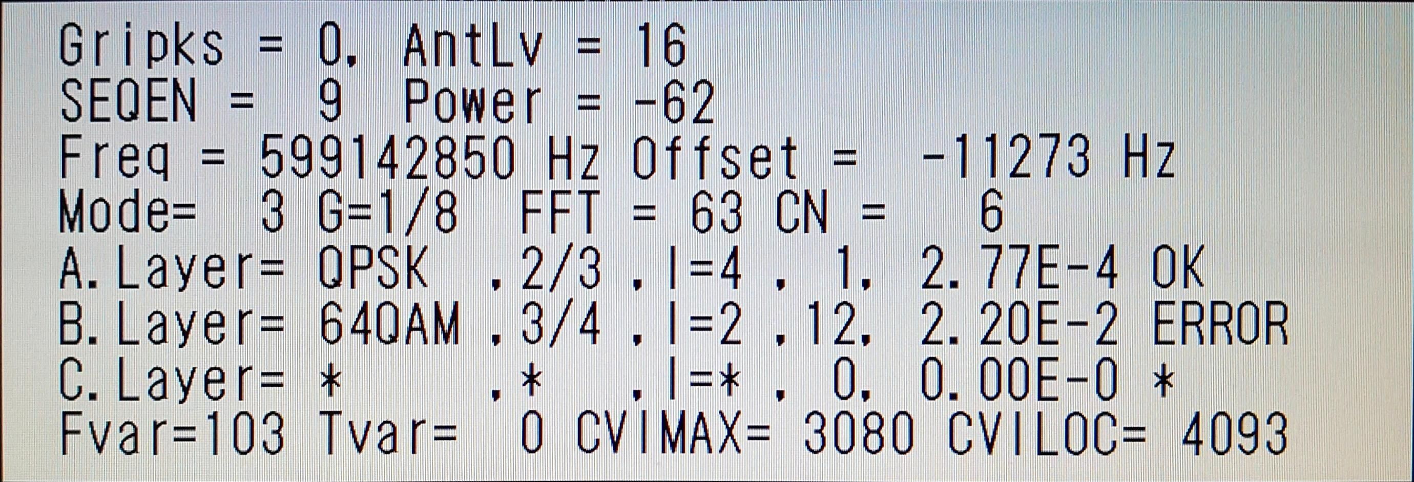 ![]() | ½©ÅÄÄ«ÆüÊüÁ÷(AAB) AntLV=70 POWER=-37dBm C/N=27dB BER 0.00E-0 |