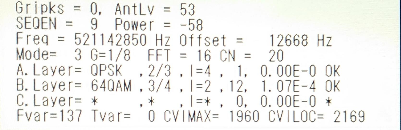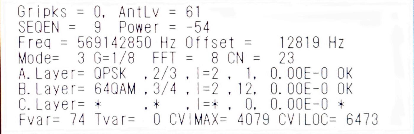 ![]() | ½©ÅÄÄ«ÆüÊüÁ÷(AAB) AntLV=61 POWER=-54dBm C/N=23dB BER 0.00E-0 |
