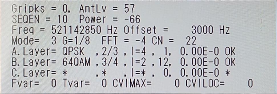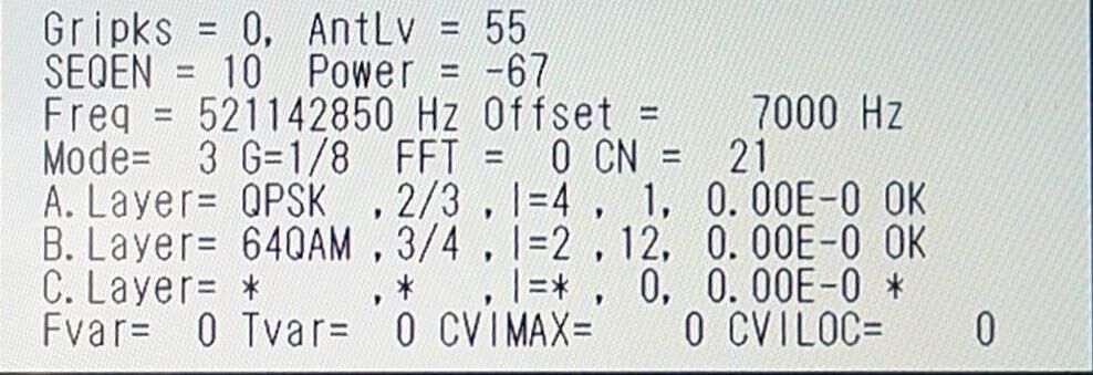 ![]() | ½©Åĥƥì¥Ó(AKT) AntLV=55 POWER=-60dBm C/N=21dB BER 0.00E-0 |