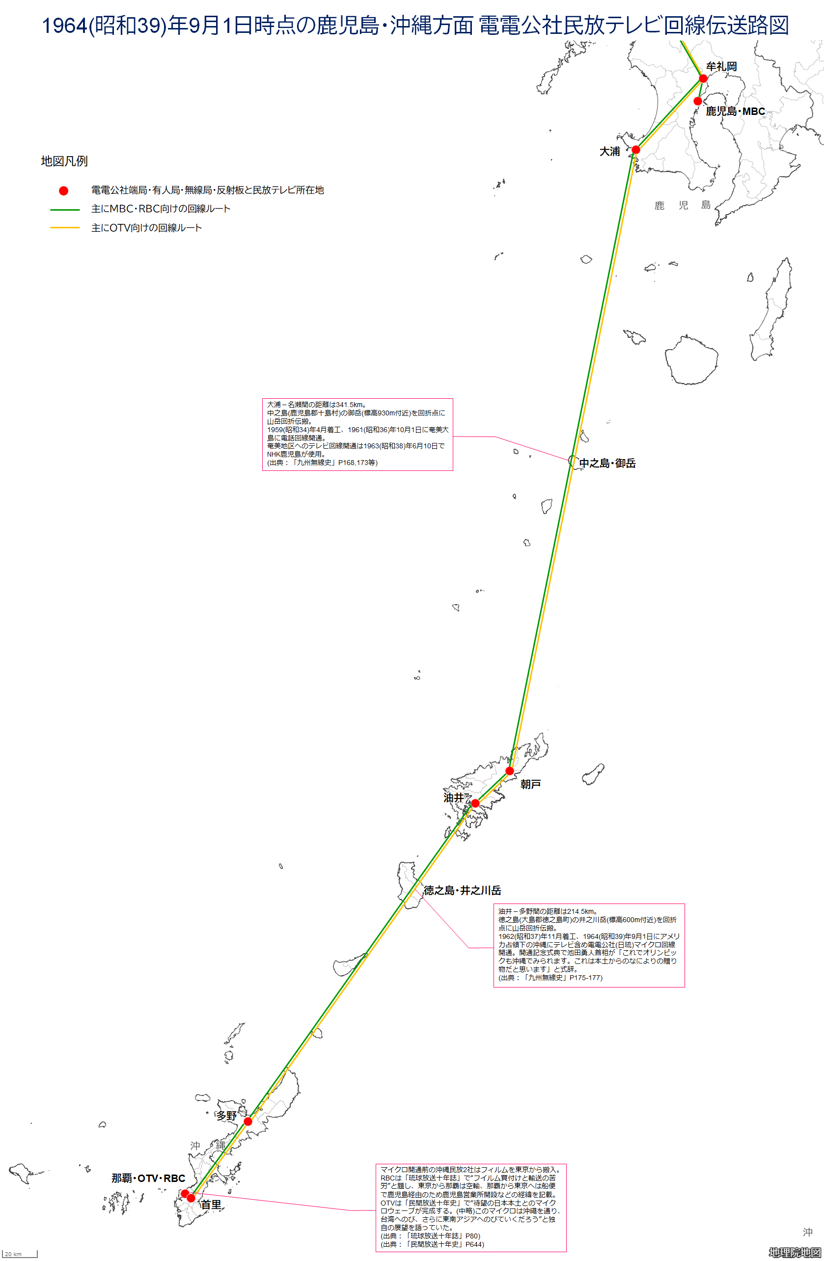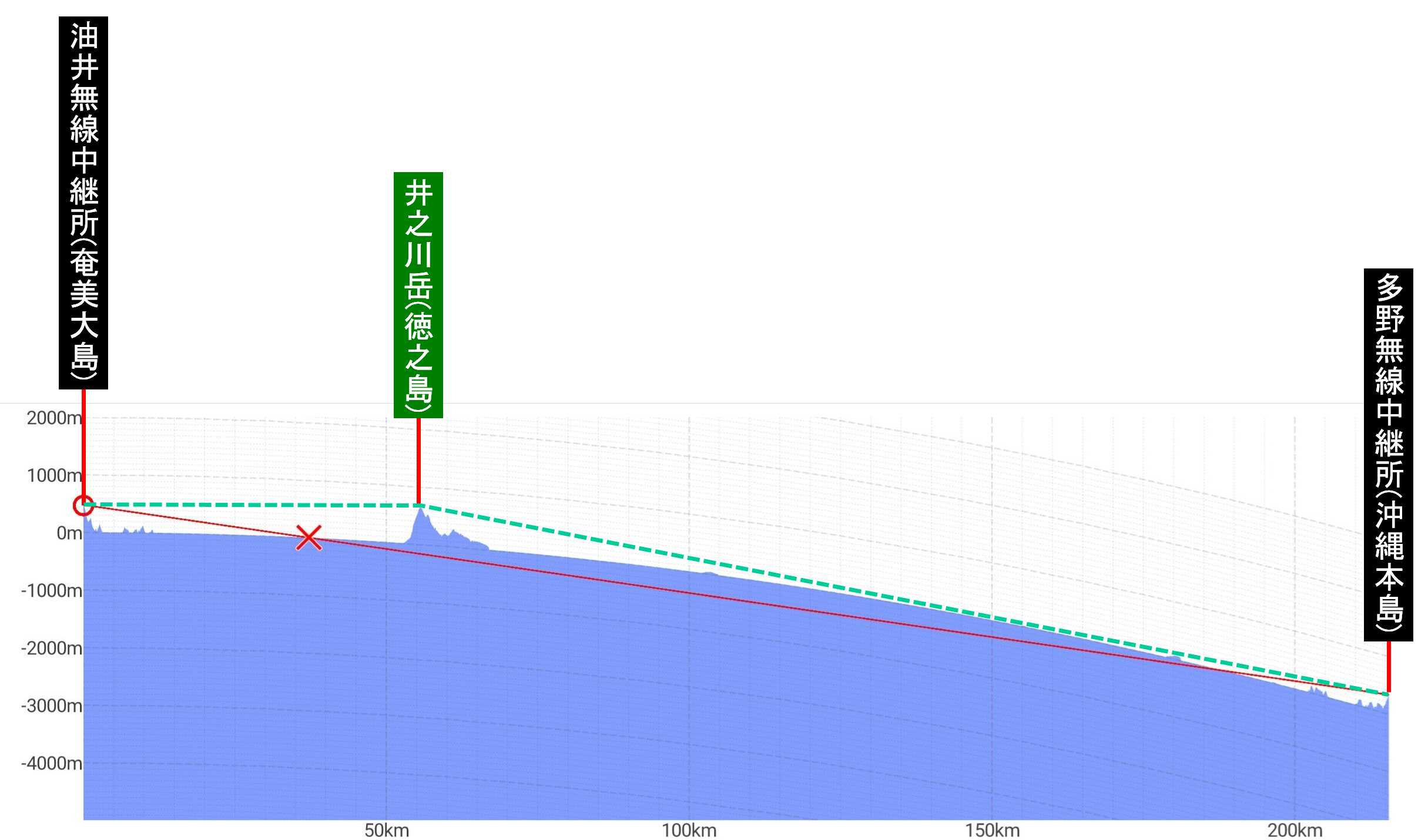 ¡¡¤³¤Î»þ¡¢Â籺¡ÝÄ«¸Í´Ö¤Ï341.5km¤¢¤ê¡¢ÃæÇ·Åç(¼¯»ùÅ縩¼¯»ùÅç·´½½Åç¼)¤Î¼çÊö¡¦¸æ³Ù¤Îɸ¹â930mÉÕ¶á¤ò»³³Ù²óÀÞÅÀ¤È¤·¤Æ¡¢ÅÅÅŸø¼ÒÉ÷¤Ë¤¤¤¨¤ÐOH(Over Horizon)Êý¼°¤Ç²óÀþ¤ò·ë¤ó¤À¤Î¤Ç¤¢¤ë¡£