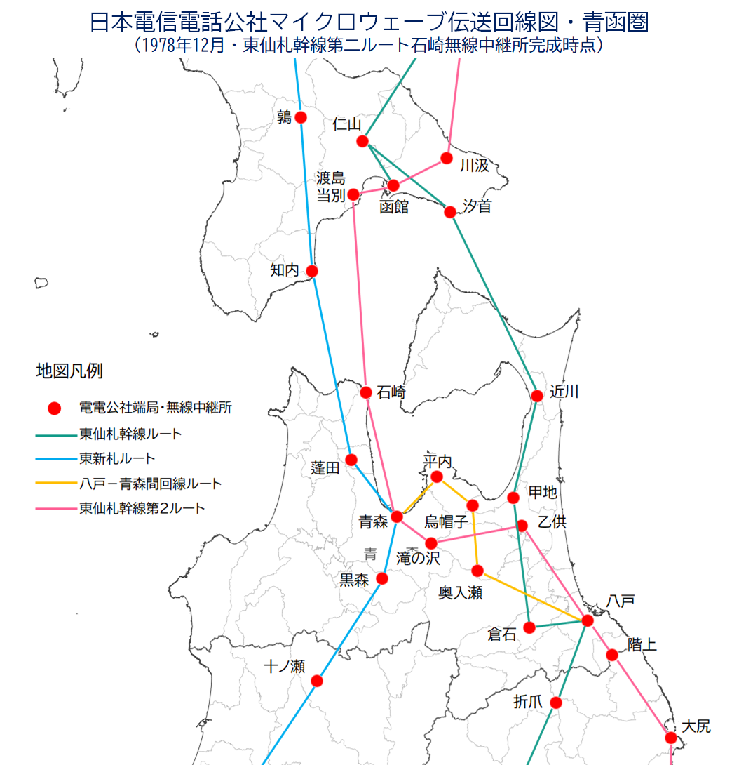 ¡¡²¼ËÌȾÅ礫¤éµµÅÄȾÅç¤ËÅϤëÅìÀ绥´´Àþ¤È¡¢ÄÅ·ÚȾÅ礫¤é¾¾Á°È¾Åç¤ËÅϤëÀÄ¿¹¡Ý»¥ËÚ´Ö²óÀþ¤Î2¥ë¡¼¥È²½¤¬¿Þ¤é¤ì¤¿¸å¤â¡¢ÅÅÅŸø¼Ò¤Ï·Ðϩ¿½Å²½¤Ç²óÀþ¾éĹ²½¤ò¿Ê¤á¡¢ÀÄ¿¹¸©Æâ¤Î¥Þ¥¤¥¯¥í²óÀþÌÖ¤ÏÊ£»¨¤ËÊÑÍÆ¤·¤Æ¤¤¤¯¡£ÎÙ¸©¤Î½©ÅĤä´ä¼ê¤Ï¸©Æâ¤òÆîË̤˽ÄÃǤ¹¤ë¶è´Ö¤Ë°ìÉô·ÐÏ©¤Î¿½Å²½¤¬¤¢¤ëÄøÅÙ¤À¤¬¡¢ÀÄ¿¹¸©¤Ïʬ´ôÅÀ¤ä·Ðͳ¤¹¤ë̵ÀþÃæ·Ñ½ê¤Î¿·Àß¡¢·ÐÏ©Êѹ¹¤Ê¤É¤¬ÅÙ¡¹È¯À¸¤·¤Æ¤ª¤ê¡¢Ë̳¤Æ»¤ËÅϤë¼êÁ°¤ÎÃÏÍýŪµòÅÀÀ¤òÇØ·Ê¤ËÅÅÅŸø¼Ò¤Ï½ÅÅÀŪ¤Ë̵ÀþÃæ·Ñ½ê¤ä¿··ÐÏ©¤ò¹½ÃÛ¤·¤Æ¤¤¤Ã¤¿¡£¤³¤ì¤ò¡¢À¤³¦½é¤ÎĶûÇÈ¿½Å̵ÀþÅÅÏó«Ä̤ÎÃϤǤ¢¤ëÀÄ¿¹¤ËÂФ¹¤ëÊÆß·¼¢ÁíºÛ¤Î±Æ¶Á¤À¤È¸À¤¤Àڤ뺬µò¤Ï¤Ê¤¤¤¬¡¢ËÌÆüËܥ롼¥×²óÀþ¤Î´°À®¸å¡¢1971(¾¼ÏÂ46)ǯ¤ËÀÄ¿¹ÅýÀ©ÌµÀþÃæ·Ñ½ê(¸½NTTÀÄ¿¹»ÙŹ)¤ËĶûÇÈ¿½ÅÄÌ¿®²óÀþ³«Ä̵ǰÈ꤬·úΩ¤µ¤ì¡¢ÁíºÛ¤È¤·¤ÆÊÆß·¼¢¤¬ÀÄ¿¹»Ô¤òÍèˬ¤·¡¢µÇ°¼°Åµ¤Ë½ÐÀʤ·¤¿µÏ¿¤¬ÀçÂæÌµÀþÄÌ¿®Éô(1978)¡ÖÅìËÌ̵Àþ»Ë¡×¤Ë»Ä¤µ¤ì¤Æ¤¤¤ë¡£ÊÆß·¼¢ÁíºÛ¤äÈà¤òÊ餦ÅÅÅŸø¼Ò¤Î̵ÀþÇɤˤȤäÆÀÄ¿¹¤¬µÇ°¤¹¤Ù¤¤æ¤«¤ê¤ÎÃϤǤ¢¤ë¤³¤È¤Ï´Ö°ã¤¤¤Ê¤¤¤Î¤À¤í¤¦¡£