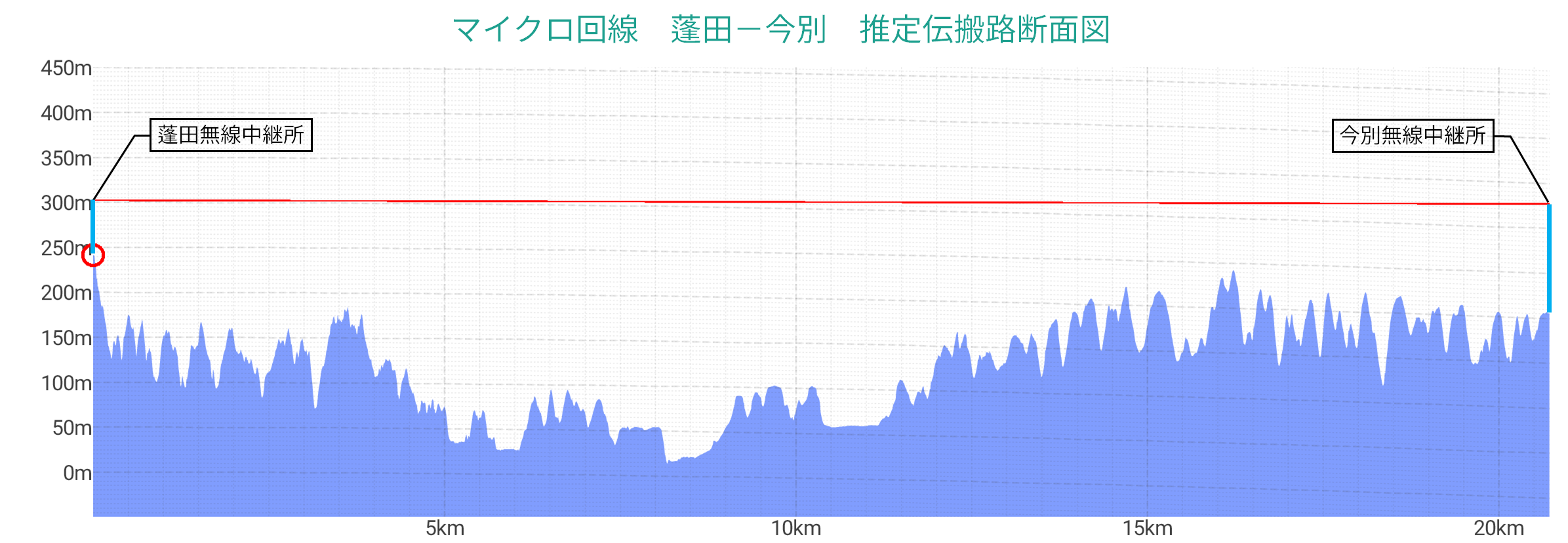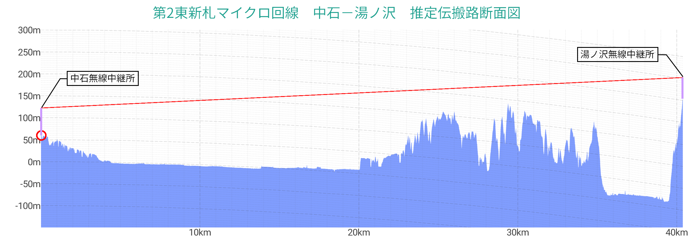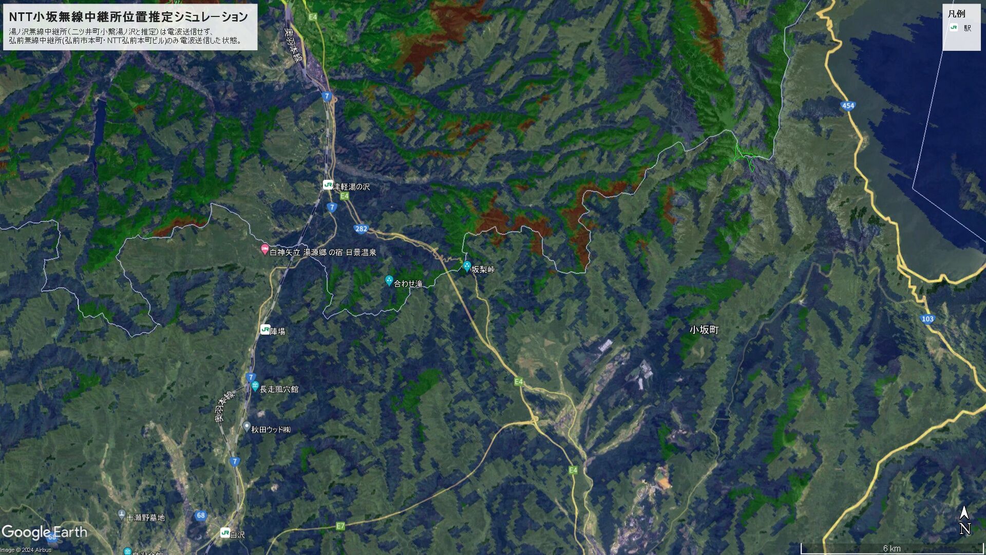 ¡¡ÃÏ·Á¿Þ¾å¤Ç¸ÞΤ¹çÃæÀФËÅÅÇÈÅã¤Ï¸«¤Ä¤±¤é¤ì¤Ê¤¤¤¬¡¢¶áÎ٤˽êºß¤¹¤ë½©Åĸ©¤Î¥Æ¥ì¥ÓÊüÁ÷¶É¤Î¸ÞΤ¹çÃæ·Ñ¶É¤Î°ÌÃÖ¤ò¸õÊäÃϤÈͽÁÛ¤·¡¢ÃÏ·ÁÃÇÌ̿ޤò¼è¤Ã¤Æ¤ß¤ë¤È¾å¿Þ¤ÎÄ̤ê¤È¤Ê¤Ã¤¿¡£½©ÅĤÎÁ÷¿®¹â¤ò80m¡¢ÃæÀФμõ¿®¹â¤ò120m¤È¿ä¬¤·¤Æ¥·¥ß¥å¥ì¡¼¥·¥ç¥ó¤·¤¿¤¬¡¢¤â¤¦¾¯¤·Å´Åã¤ÏÄ㤯¤Æ¤âÄÌ¿®²Äǽ¤Ê;͵¤¢¤ëÃÏ·Á¤Ç¤¢¤ë¡£