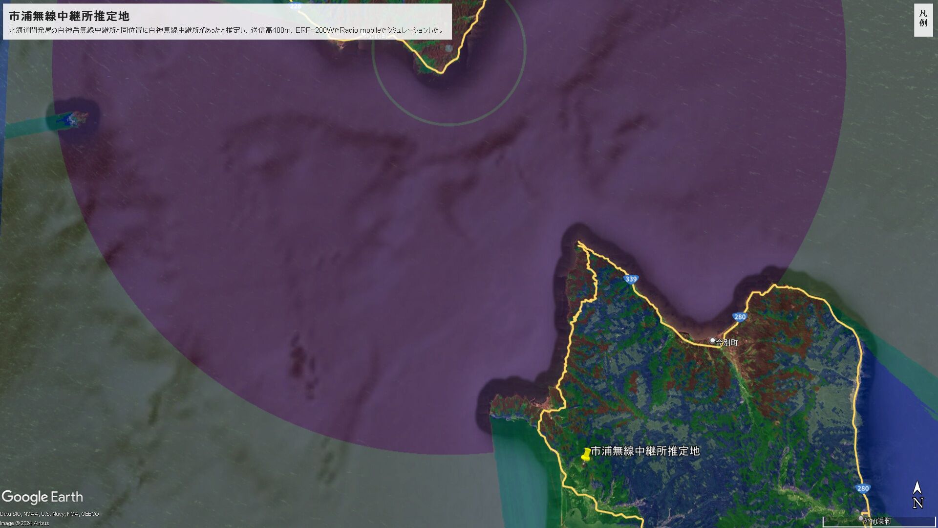 ¡¡µÈ²¬Æ½¤ò±Û¤¨¤ë¹ñÆ»228¹æ¤ÎµìÀþ¤«¤éʬ´ô¤¹¤ëÎÓÆ»¤ò¿Ê¤à¤È¡¢É¸¹â352m¤ÎÇò¿À³Ù¤¬¤¢¤ê¡¢¤³¤³¤Ë¤ÏË̳¤Æ»³«È¯¶É¤ÎÇò¿À³Ù̵ÀþÃæ·Ñ½ê¤¬Â¸ºß¤¹¤ë¡£Ë̳¤Æ»³«È¯¶É¤Î̵ÀþÃæ·Ñ½ê¤ÈƱ°ÌÃÖ¤À¤Ã¤¿¤È¿äÄꤷ¡¢Á÷¿®¹â400m¡¢ERP=200W¤ÇRadio mobile¤Ç¥·¥ß¥å¥ì¡¼¥·¥ç¥ó¤·¤¿¤Î¤«²¼¿Þ¤Ç¤¢¤ë¡£