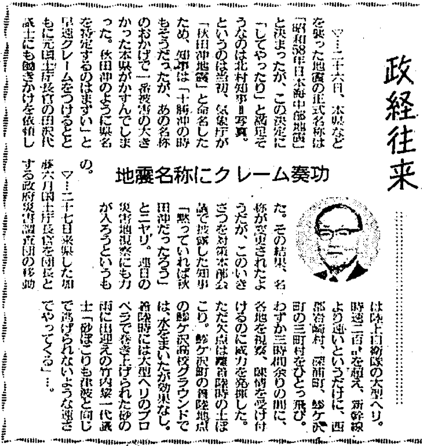 ¡¡È¯ºÒÅöÆü1983(¾¼ÏÂ58)ǯ5·î26Æü¤Î¡ÖÅì±üÆüÊó¡×ͼ´©¤Î°ìÌ̤ϡÖÅìËÌÃÏÊý¤Ë¶¯¤¤ÃϿ̡פÎÂê̾¤Ç¡¢ÀÄ¿¹¸©Æâ¤ÎÈï³²¾õ¶·¤òÊ󤸤Ƥ¤¤ë¤¬¡¢¤½¤ÎÃæ¤Ç»È¤ï¤ì¤Æ¤¤¤ëñ¸ì¤Ï¡Ö½©ÅIJÃϿ̡פǤ¢¤ë¡£°ìÎã¤ò°úÍѤ·¤è¤¦¡£