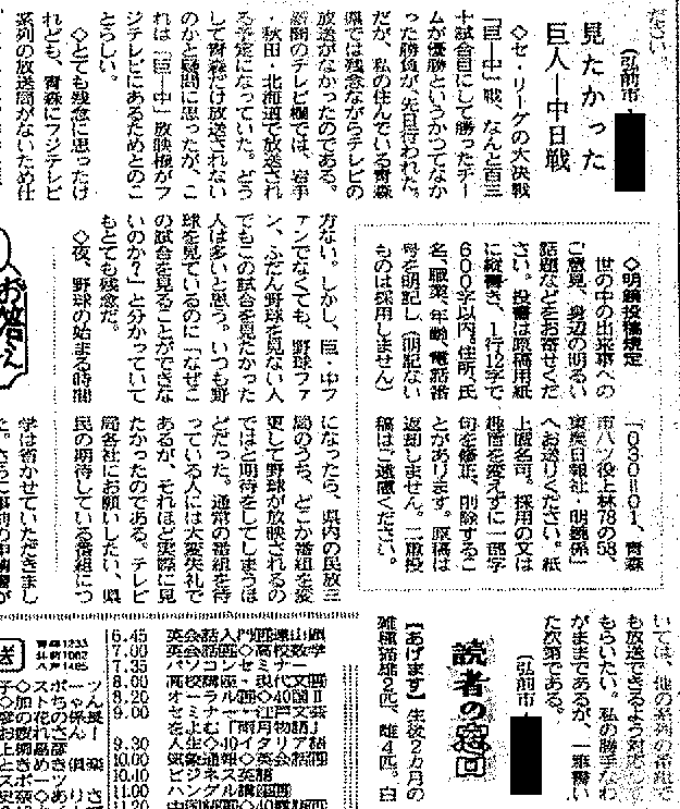 ¡¡Åì±üÆüÊó¼Ò¤Ë¤Ï¡¢¡Ö¸©Æâ¤Ç´ä¼ê¡¢½©ÅÄ¡¢Ë̳¤Æ»¤Î¥Æ¥ì¥Ó¤¬¸«¤é¤ì¤ë¤Î¤Ï¤É¤³¤«¡×¤È¤ÎÆÉ¼Ô¤«¤é¤ÎÌ䤤¹ç¤ï¤»¤¬¤¢¤Ã¤¿¤Û¤«¡¢¸©Æâ̱Êü»°¼Ò¡¢NHKÀÄ¿¹ÊüÁ÷¶É¤Ë¤âÊü±ÇͽÄê¤ò¿Ò¤Í¤ëÅÅÏ䬿ô½½·ï¤¢¤ê¡¢¿¼Ìë¤Þ¤ÇÌ䤤¹ç¤ï¤»¤¬Â³¤¤¤¿¡£ÀÄ¿¹»ÔÆâ¤Î¤¢¤ëÀIJÌŹ·Ð±Ä¼Ô(»Í»Í)¤Ï¡ÖºÇ¸å¤ÎºÇ¸å¤Ë¤Ê¤Ã¤Æ¥Æ¥ì¥Ó¤ÇÌîµå´ÑÀï¤Ç¤¤ºÈó¾ï¤Ë»Äǰ¡×¤È¤¬¤Ã¤¯¤ê¡£¥é¥¸¥ª¤Ë¤·¤¬¤ß¤Ä¤°ì´î°ìÍ«¤¹¤ëÌîµå¥Õ¥¡¥ó¤â¿¤«¤Ã¤¿¡£