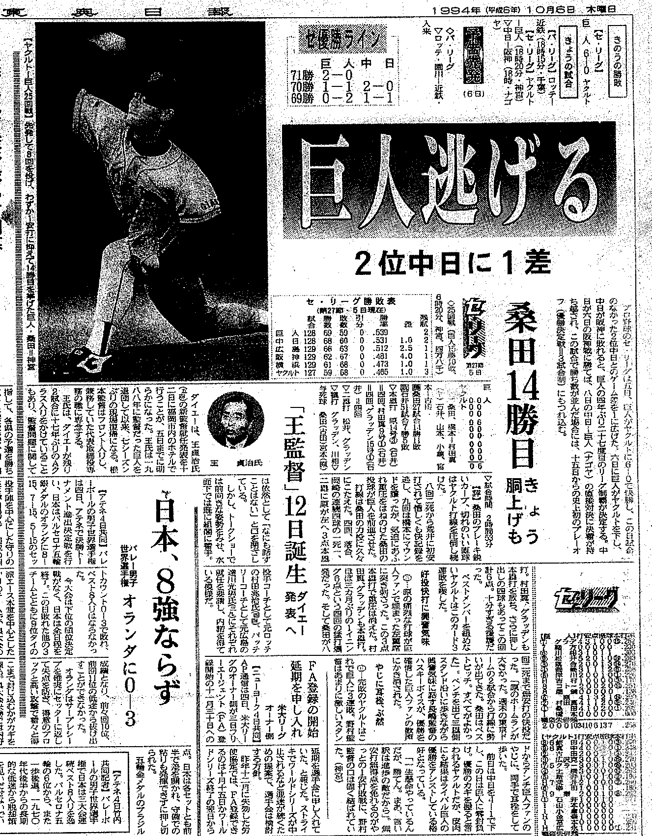 ¡¡10·î6Æü¤ÎÅì±üÆüÊó¤Ï¡¢¡Öµð¿Í¡¢Æ¨¤²¤ë¡×¤ÈÂ硹Ū¤Ê¸«½Ð¤·¤Ç¡¢10·î5Æü¤Î¥ä¥¯¥ë¥ÈÀï¾¡Íø¤òÊ󤸤Ƥ¤¤ë¡£