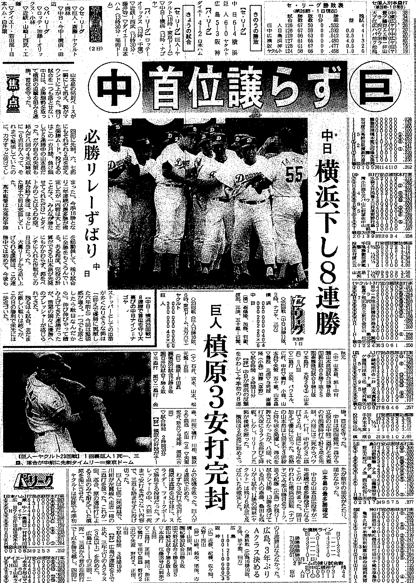 ¡¡10·î2Æü¤ÎÅì±üÆüÊó¤Ï¡¢¡Ö(Ãæ)¼ó°Ì¾ù¤é¤º(µð)¡¡ÃæÆü²£ÉͲ¼¤·8Ï¢¾¡¡¡µð¿ÍË긶3°ÂÂÇ´°Éõ¡×¤È¡¢Ä«´©6Ì̤ÇÂ礤¯¼è¤ê¾å¤²¤Æ¤¤¤ë¡£